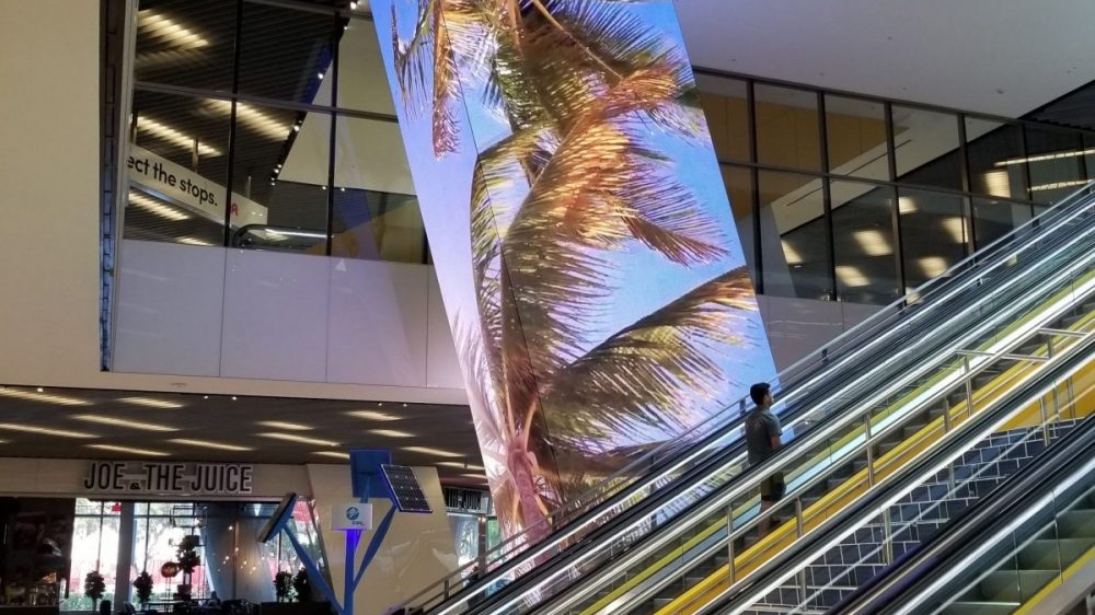 After evaluating the remaining field, Brightline chose to partner up with Nanolumens, the industry-leading provider of large-format LED visualization solutions. Known for their versatility and performance, Nanoulmens displays can be built to any size, shape, or curvature. The capable experts from Nanolumens began by engineering the mounting structure that would attach the display panels to the angled column. That done, the team installed a display on each side of the structure, each of different dimensions. The displays checked in at 35 feet by 9 feet, 34.5 feet by 9 feet, 35 feet by 11 feet, and 14.5 feet by 11 feet. Though formed from separate panels, the four displays merge seamlessly at each corner to create the visual of a fully wrapped column. Built with a 6.3 millimeter pixel pitch throughout, the displays now showcase content 24 hours a day. Passengers ascending or descending the adjacent bank of escalators are immersed with display content like train schedules, amenities details, and station alerts.