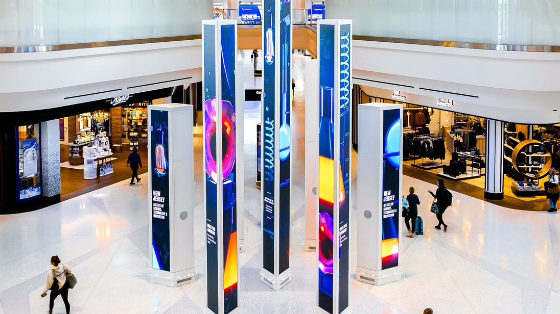 As travelers descend into the Retail Hall, they are met by the Forest of Firsts—a breathtaking tribute to the trailblazing essence of New Jersey. Comprising towering dvLED pillars that emulate a digital forest, this installation showcases the commitment to innovation and creativity.