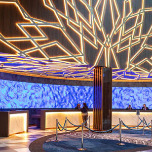 Casinos strive to create environments that encourage fun and games, and when New York’s Seneca Niagara Resort & Casino renovated its lobby, they realized they had an opportunity to ‘wow’ their guests with a huge digital display and engaging visual content. Enter a 64.5-foot-wide by 6-foot-tall, 2.5 mm pixel pitch Nanolumens display. Positioned behind their front lobby desk, the display captivates every visitor with high-definition video and digital visuals that showcase Niagara Falls scenery and local native culture. What we enjoy most about this display is the feeling it inspires within the casino guests who engage with it. People walk into the lobby and are immediately hit with a dynamic visual experience that sets the tone for their entire time on site. Further information about this install can be found here.