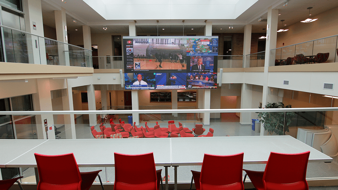 And that was exactly the point. As a media school, it’s not only important to engage students and visitors with news and information, but also to show that the campus and programs are technologically advanced. With the ability to use the display for presentations, television broadcasts, and even as six distinct screens through a split-screen interface, the school has gained a technology platform on par with professional newsrooms and large public event spaces like stadiums and arenas. In split-screen, students can use the Tunity smartphone app to listen to any of the currently playing broadcasts.